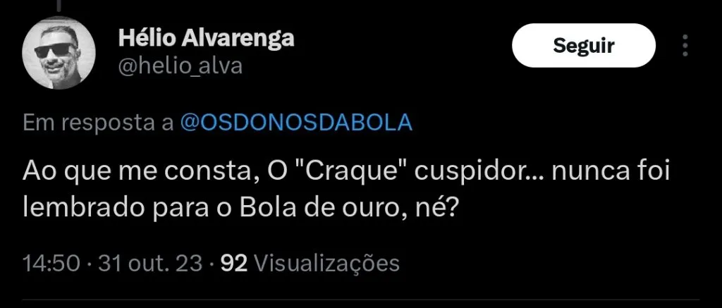 “A entrevista dele para o Band Sports. ‘Se o futebol fosse individual eu ganharia’. Quer dizer então que eu aqui faço o programa sozinho? Quer dizer que o Velloso não tem a importância dele, o Sousa não tem a importância dele? Só eu então? Sou o grandão? Não sou não. Todo mundo tem a sua importância. Na seleção, o Neymar tem só um título que foi as Olimpíadas. Nem a Copa América ele ganhou. Jogaram contra o time C da Alemanha e foi no sufoco“, acrescentou o apresentador.