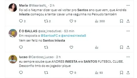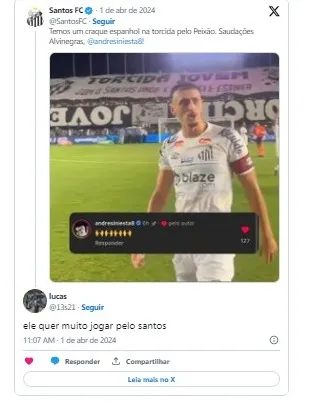 O Alvinegro Praiano prontamente respondeu ao comentário de Iniesta com saudações, enquanto a torcida santista nas redes sociais clamava para que a diretoria contratasse o meio-campista espanhol.