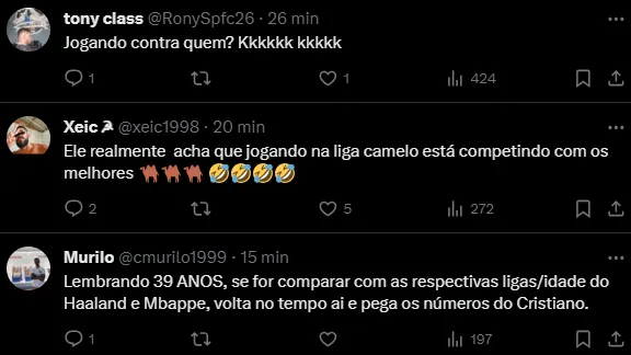 “Fui o artilheiro do ano passado. Imagina superar animais jovens como o Haaland? Estou orgulhoso, vou fazer 39 anos daqui a pouco”, sinalizou CR7 durante o bate-papo.