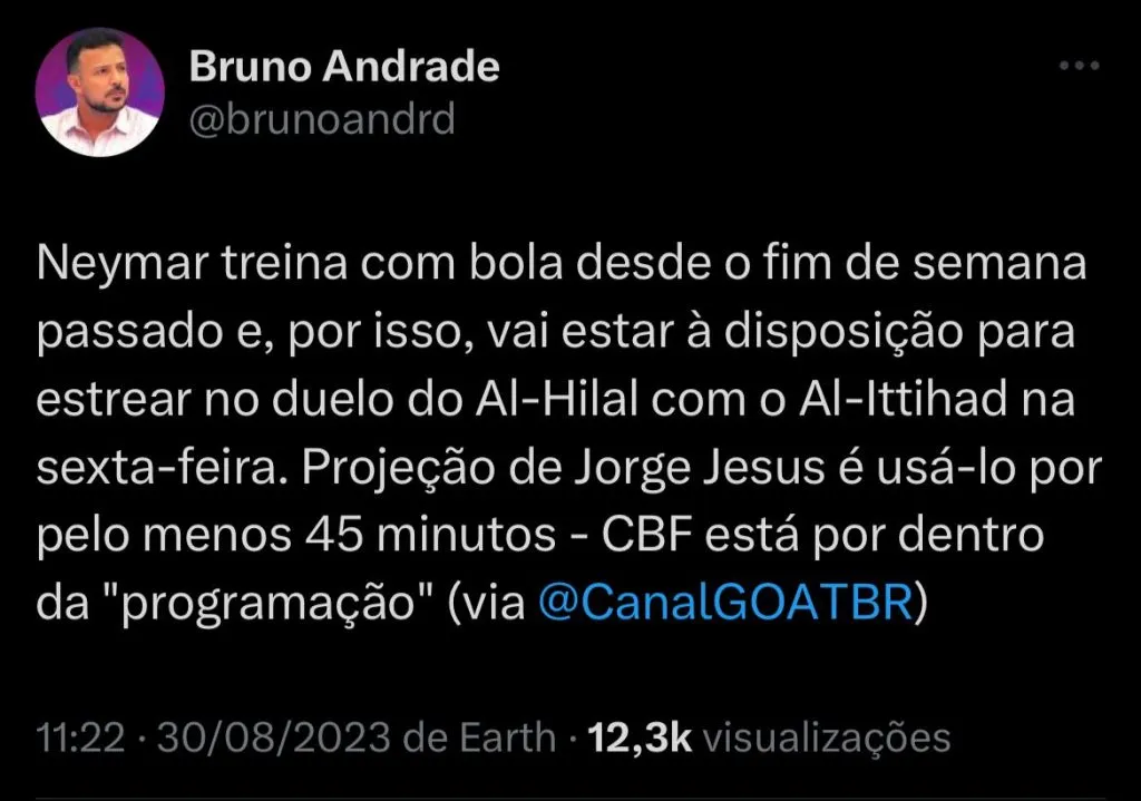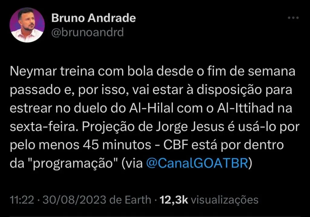 Segundo informações do jornalista Bruno Andrade, o atacante Neymar deve estrear em partida do Al-Hilal contra o Al-Ittihad, na próxima sexta-feira.