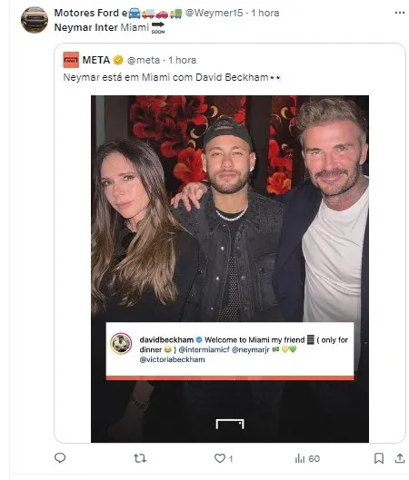 David Beckham, ex-jogador inglês e um dos proprietários do Inter Miami, time dos Estados Unidos, causou alvoroço nas redes sociais ao postar uma foto ao lado de Neymar e fazer uma brincadeira sobre uma possível contratação do brasileiro.