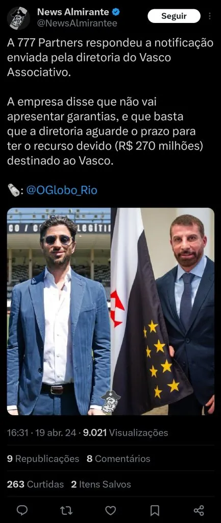 Fato é que o ex-jogador quer fazer com que o Almirante tenha mais poder de fala, visto que é sócio dos estrangeiros no negócio e segue sendo dono de uma porcentagem das ações da SAF.