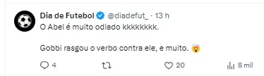 O ex-presidente do Corinthians, Mário Gobbi, que ficou de 2012 a 2015 no clube, deu uma entrevista ao podcast “Tomando uma com…” e fez duras críticas ao treinador do Palmeiras, Abel Ferreira.