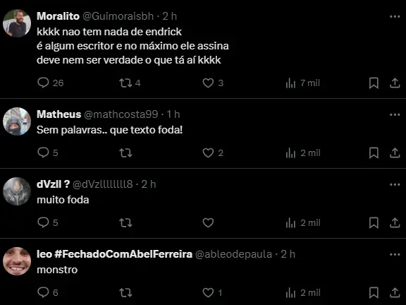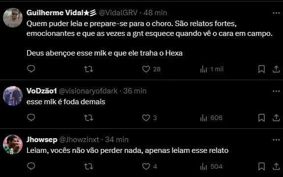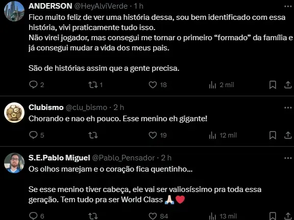 “Mas, irmão, eu estava falando sério. Eu tinha certeza que conseguiria, e a nossa mãe ainda chora quando se lembra disso. Ela sempre disse que as palavras têm poder”, continuou Endrick.