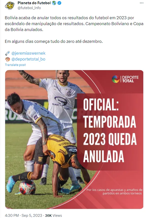 Em um desenvolvimento surpreendente, o Campeonato Boliviano foi anulado devido a suspeitas de manipulação, de acordo com informações do jornalista Jeremias Wernek e do portal ‘Deporte Total‘. Todos os jogos e resultados da Copa da Bolívia e do Campeonato Boliviano de 2023 foram anulados.