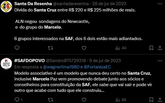 Desde 2022 são especuladas as possibilidades de Marcelo e Falcão investirem no Santa Cruz através da SAF. A ideia do Tricolor é vender 90% das ações para investidores.