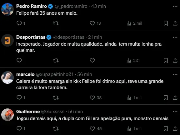 Felipe fará 35 anos em maio e estava sendo procurado por outros clubes além do Nottingham Forest como o próprio futuro ex-jogador confirmou na nota oficial publicada nas redes sociais, agitando a torcida do Corinthians.