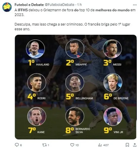 O ranking da IFFHS colocou o norueguês Erling Haaland, do Manchester City, em primeiro lugar, seguido por Kylian Mbappé, do Paris Saint-Germain, e Lionel Messi, atuando pelo Inter Miami nos Estados Unidos.