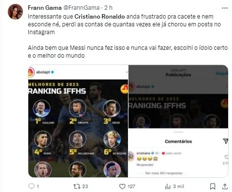 O renomado atacante Cristiano Ronaldo, atualmente no Al-Nassr, da Arábia Saudita, demonstrou sua insatisfação com o ranking de melhores jogadores de 2023 divulgado pela IFFHS (Federação Internacional de História e Estatísticas do Futebol).