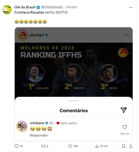 Em uma publicação do jornal português A Bola, que divulgava o ranking, Cristiano Ronaldo reagiu com emojis de risada, evidenciando seu desagrado com a ausência na lista.