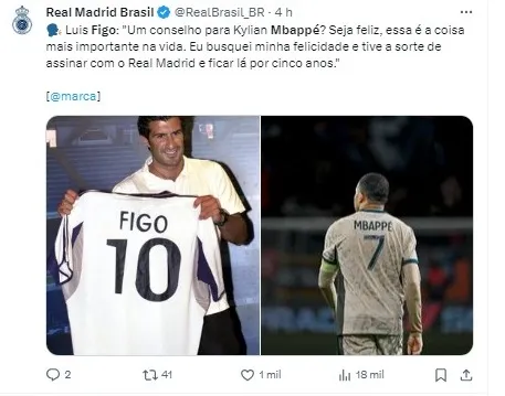 Nesse contexto, Luís Figo, uma lenda do clube merengue, concedeu uma entrevista ao jornal espanhol Marca, na qual aconselhou o jovem francês a buscar a felicidade ao chegar às terras espanholas.
