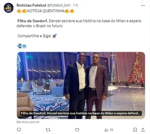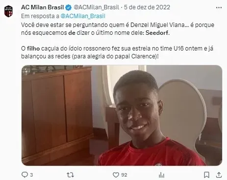Denzel, filho do ex-meia Clarence Seedorf, está traçando seu caminho no mundo do futebol nas categorias de base do Milan aos 16 anos, e sua identificação com o Brasil está se tornando cada vez mais evidente.