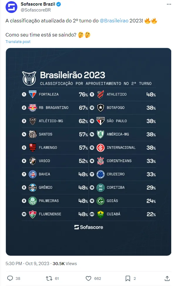Com o segundo turno em andamento, o Brasileirão tem nos proporcionado surpresas tanto na parte superior quanto na parte inferior da tabela de classificação. O Fortaleza, por exemplo, lidera o returno em termos de aproveitamento, conforme informações do Sofascore Brasil.