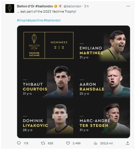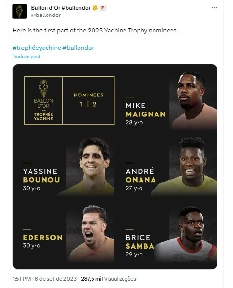 A prestigiada premiação Bola de Ouro de 2023, concedida pela revista France Football, revelou os jogadores que concorrem ao cobiçado troféu nesta quarta-feira (6). Entre os destaques, está a categoria de goleiro, que premia o melhor arqueiro do mundo com o Prêmio Yashin, em homenagem ao lendário goleiro soviético Lev Yashin.