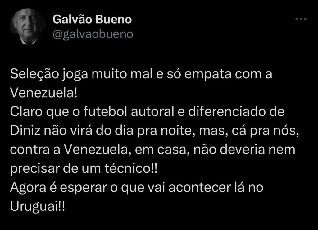 “Seleção joga muito mal e só empata com a Venezuela! Claro que o futebol autoral e diferenciado de Diniz não virá do dia pra noite, mas, cá pra nós, contra a Venezuela, em casa, não deveria nem precisar de um técnico!!
