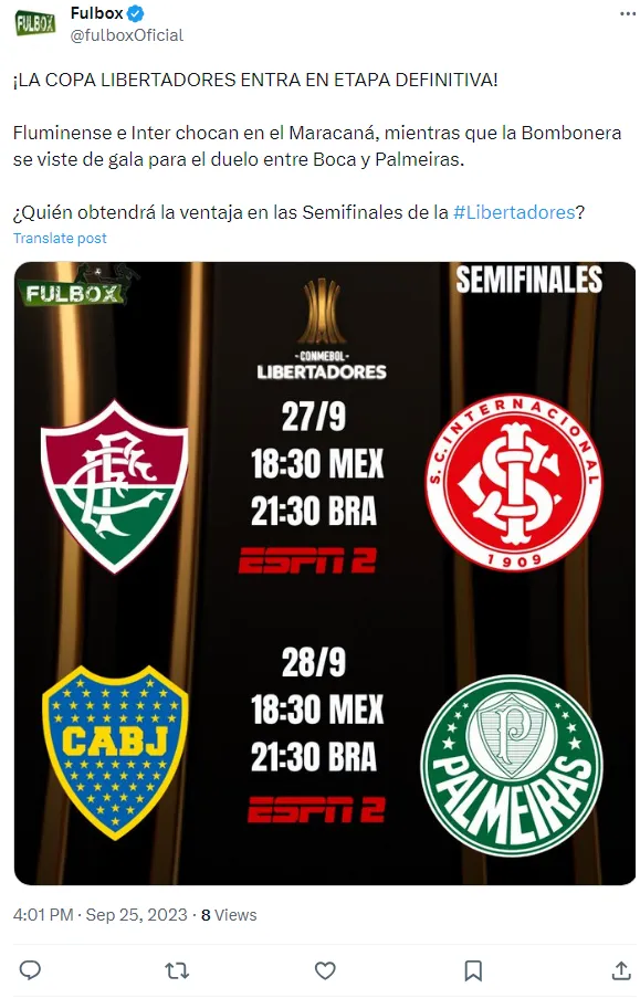 Nesta semana, teremos os jogos de ida das semifinais. Na quarta-feira (27), o Fluminense enfrentará o Internacional, em um confronto brasileiro. Já na quinta-feira (28), teremos o confronto entre o Boca Juniors e o Palmeiras, equipes com históricos ricos na competição.