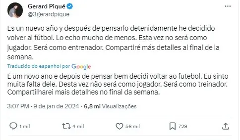 Em uma postagem enigmática em suas redes sociais, Piqué revelou que, neste novo ano, retomará sua jornada no futebol, mas dessa vez não será como jogador.