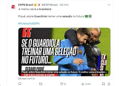 “Se ele no futuro for treinar uma seleção, eu creio que a melhor, com mais diferencial, para mim e para como pensa o Pep, é a Seleção Brasileira”, disse Piqué em entrevista à ESPN.