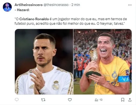 Hazard, que se aposentou em junho de 2023 aos 32 anos, afirmou com convicção que, em termos de futebol puro, ele foi superior ao eterno camisa 7 e ficou em dúvida quanto a Neymar.