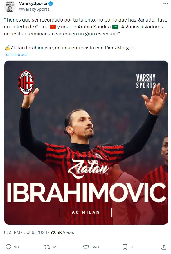 O atacante sueco de 42 anos anunciou sua aposentadoria em junho, encerrando uma carreira que incluiu quase mil jogos e 573 gols. Durante a entrevista, Ibrahimović também mencionou as propostas que recebeu da China e da Arábia Saudita.