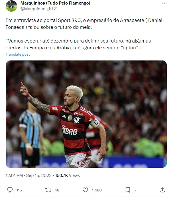 O empresário de Arrascaeta enfatizou que o destino do jogador só será decidido no final de 2023. Portanto, tanto o jogador quanto a diretoria do Flamengo estão focados em preservar as competições até o final desta temporada.
