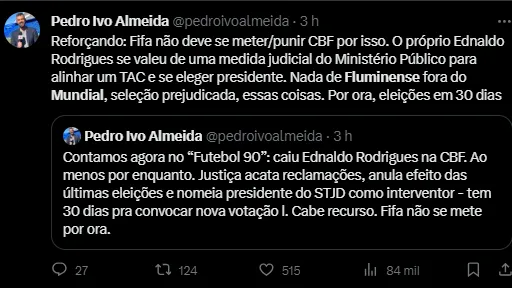 Tudo começou com o presidente da Confederação Brasileira de Futebol (CBF), Ednaldo Rodrigues, sendo afastado da função para que novas eleições ocorram em 30 dias.