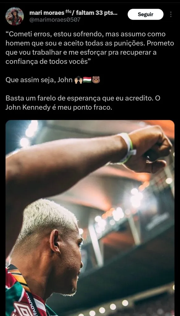 Por meio do seu Instagram, o atacante John Kennedy falou pela primeira vez sobre o seu afastamento dos gramados. Ele pediu desculpas aos torcedores e revelou que as atitudes recentes afetaram a sua vida pessoal.