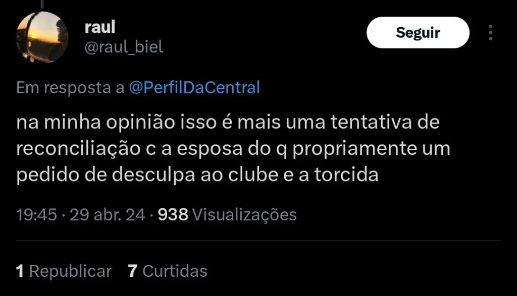 “Venho me manifestar sobre os últimos episódios. Sei que meu comportamento não foi dos melhores nos últimos dias sei que tanto em campo como fora não venho entregando o que esperam de mim. Quero pedir desculpas ao clube a comissão técnica aos companheiros de equipe e principalmente a torcida que sempre me apoiou mas queria deixar claro que eu não participei da festa na concentração que foi noticiado“, iniciou o jogador.