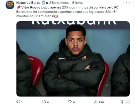 Desde sua chegada ao Barcelona, Vitor Roque tem sido frequentemente utilizado como reserva em oito dos nove jogos disputados, com apenas 164 minutos jogados de um total de 720 possíveis. Esse baixo tempo de jogo contrasta com o alto investimento feito pelo clube, que desembolsou 30 milhões de euros pelo jogador.