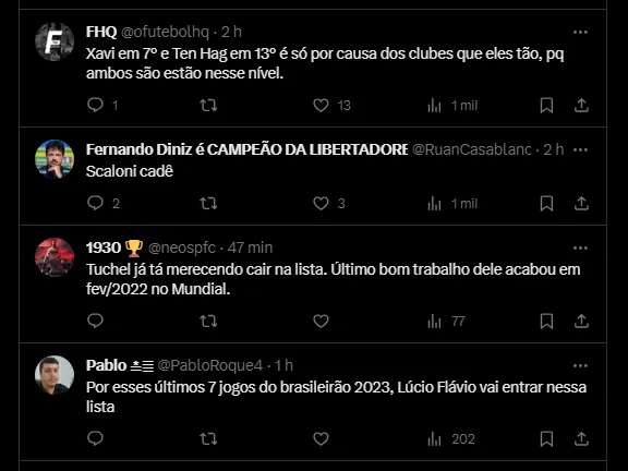 A FourFourTwo ainda elenca Fernando Diniz como o brasileiro que está melhor colocado na lista dos 50 melhores treinadores do mundo na atualidade. O comandante acabou de ser campeão da Libertadores.