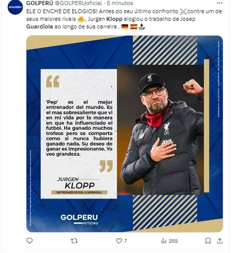 “Pep é o melhor técnico do mundo, não tenho nenhum problema em dizer [isso e estou] tendo uma vida muito boa, mesmo sem estar perto disso”, afirmou Klopp.