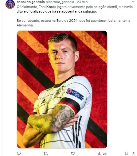 Em um comunicado nas redes sociais, Kroos revelou sua decisão de voltar atrás em sua aposentadoria internacional após um pedido do técnico Julian Nagelsmann.