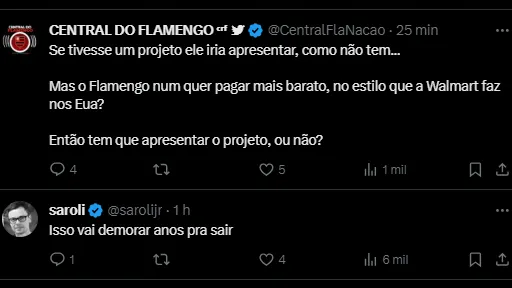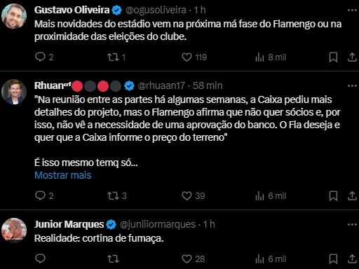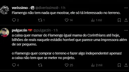 “Flamengo não pretende apresentar à Caixa o seu projeto de estádio e quer saber só o valor para comprar o terreno”, destaca a repercussão do Planeta do Futebol (@futebol_info), no Twitter.
