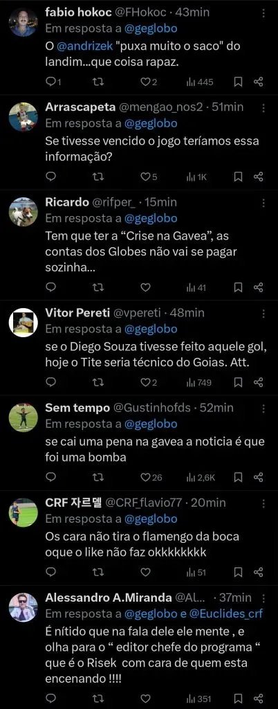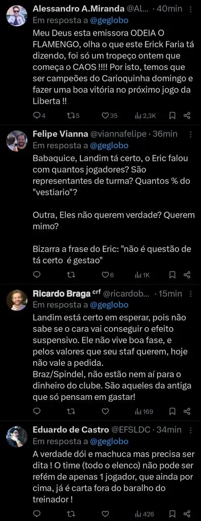 O carioca tem bons contatos no Fla pelos anos que acompanha o clube carioca e afirma que a postura de Rodolfo Landim em relação à permanência de Gabriel Barbosa não pegou bem no vestiário rubro-negro.