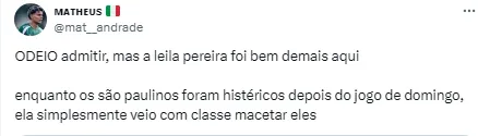 O presidente do São Paulo, Julio Casares criticou a postura de Abel Ferreira na beira do campo e pediu mudança de postura da Federação Paulista de Futebol (FPF) com o treinador. Leila, por sua vez, também criticou o mandatário são-paulino e revelou que ele não a procurou desde os problemas. “Eu não tenho que procurá-lo. Ele quem tem que me procurar. Fui desrespeitada na casa dele. Ele teria que me procurar e ainda pedir desculpas públicas. Quero desculpas públicas e o comprometimento de que isso não vai acontecer mais“