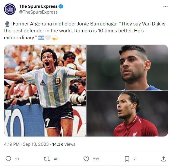 Burruchaga também comparou o zagueiro holandês com Cuti Romero, defensor argentino que foi uma das principais peças da Copa do Mundo de 2022 no título argentino. Atualmente no Tottenham, da Inglaterra, Cuti é o favorito de Jorge Burruchaga.