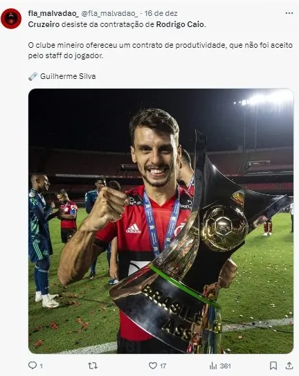 “Encerrei um ciclo importantíssimo na minha carreira, em que fui muito feliz. Acho que, para mim, isso é o mais importante. Agora, em 2024, é a gente aguardar, esperar o que será melhor para minha carreira, com muita paciência, muita calma para tomarmos a melhor decisão. Tenho a certeza de que esse novo objetivo, esse novo ciclo que vai se iniciar em 2024 será tão especial quanto foi nesses cinco anos que tive com o Flamengo”, afirmou Rodrigo Caio.