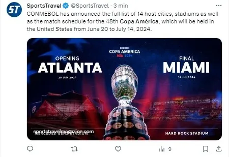 A Copa América de 2024, que será realizada nos Estados Unidos, teve todos os seus estádios definidos nesta segunda-feira (4) pela Conmebol. Um total de 14 estádios em 10 estados receberão os 32 jogos do torneio, que ocorrerá entre 20 de junho e 14 de julho do próximo ano.