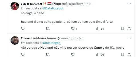 “O Cano brigaria posição com esse jogador aí. Brigaria, muita gente me criticou, mas eu estou vendo. É só olhar os últimos jogos aí, as finais. São nove finais, zero gols e zero assistências. Fraco não é, mas faz alguns ‘golzinhos’ aí”, afirmou Luis Fabiano, referindo-se a Haaland.