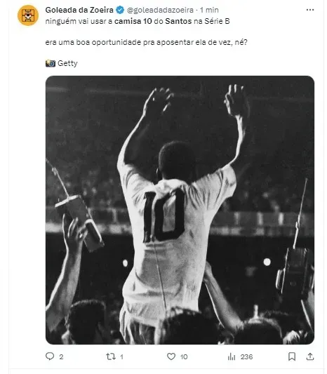 “Já antecipo também uma ideia: vamos propor ao Conselho Deliberativo que no Campeonato Paulista vamos atuar normalmente com a camisa número 10. No Campeonato Brasileiro, enquanto o Santos não subir e estar no seu patamar digno, nós não atuaremos com a camisa 10, em memória e honra”, declarou Teixeira.