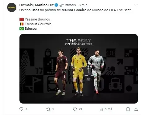 Ederson, destaque do Manchester City, aparece na lista ao lado de Courtois, do Real Madrid, e Bono, atualmente no Al-Hilal após grande passagem pelo Sevilla.