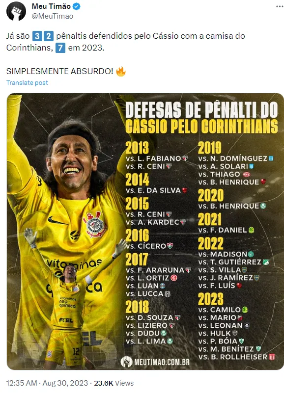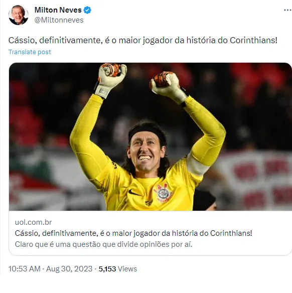 “Os mais antigos, por exemplo, apontavam Cláudio ou Luizinho como os maiores jogadores da história alvinegra. Meus contemporâneos costumam escolher Rivellino como o mais importante atleta da história do clube do Parque São Jorge. A molecada que hoje tem seus 40 anos costuma indicar Marcelinho Carioca para o posto. Mas eu, como legítimo representante do Timão na mídia esportiva, digo sem dúvidas: Cássio Ramos não é apenas o melhor goleiro, mas também é o maior jogador da rica história do Coringão!”; disse Milton Neves