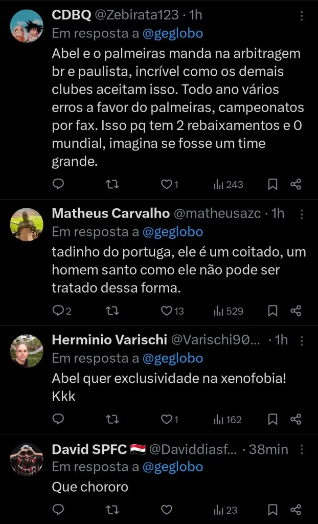 “Atacar gratuitamente um treinador… Se acham que o Abel está procedendo de uma forma que acham que não seja correta com arbitragem, a arbitragem que tem que dizer”, completou Leila.