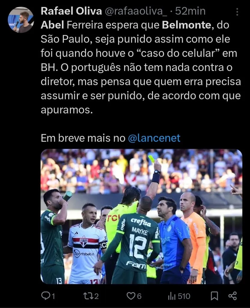 Abel Ferreira ainda não iniciou qualquer tipo de processo ao diretor Carlos Belmonte, porém é certo que o fato mexeu com o treinador e ele tem todo aval do Palmeiras para agir como bem quiser dentro das medidas legais e cabíveis para a situação ocorrida no Choque-Rei.