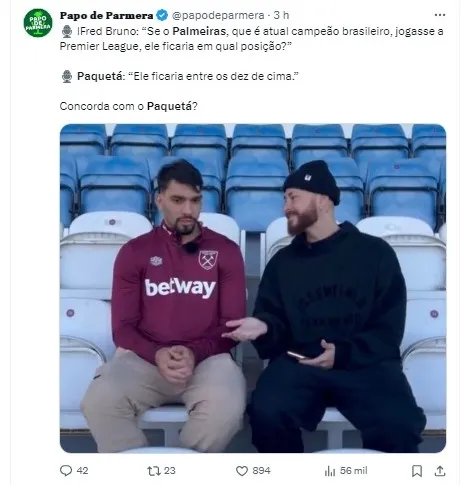 Em um debate sobre o desempenho do Palmeiras, atual bicampeão nacional, em competições internacionais, Paquetá destacou a força da equipe de Abel Ferreira, sugerindo que ela seria capaz de competir de igual para igual em um cenário como a Premier League.