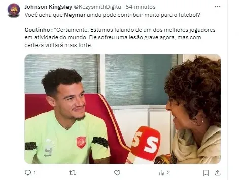 Atualmente, jogando no Al-Duhail, do Catar, emprestado pelo Aston Villa, Coutinho avaliou o momento de Neymar, seu ex-companheiro de seleção.