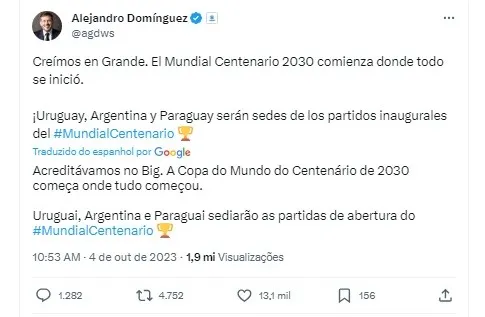 Em um anúncio que empolgou os amantes do futebol em todo o mundo, o presidente da Conmebol, Alejandro Domínguez, revelou através das redes sociais nesta quarta-feira (4/10) que os jogos de abertura da Copa do Mundo de 2030, o Mundial do Centenário, terão lugar na América do Sul.