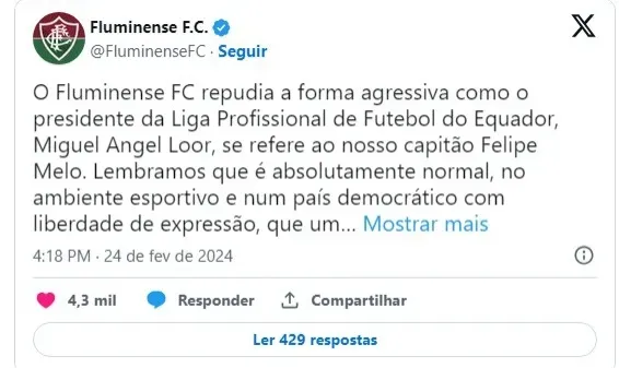 Diante dessas declarações, o Fluminense emitiu uma nota oficial repudiando veementemente a postura agressiva do presidente da Liga Profissional de Futebol do Equador, Miguel Angel Loor, em relação a Felipe Melo.
