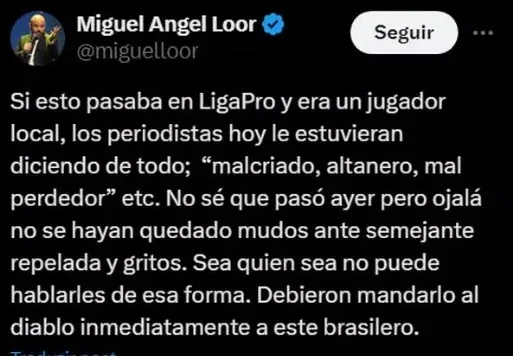 Desta vez, o presidente da LigaPro Equatoriana, Miguel Angel Loor, lançou comentários provocativos em suas redes sociais, atacando o zagueiro tricolor e desencadeando uma série de reações acaloradas.