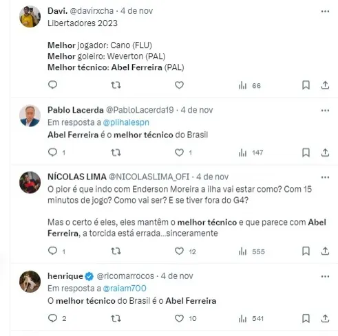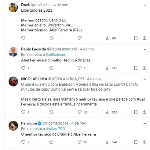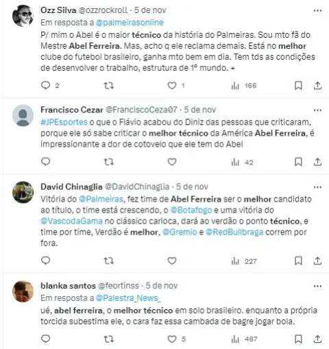 “Abel Ferreira transformou o futebol brasileiro desde que chegou em 2020 e rapidamente se tornou o técnico estrangeiro com mais troféus no país (…) Ele transformou a mentalidade do Palmeiras em vencedores em série. Abel Ferreira é justamente o fator de bem-estar do futebol brasileiro e já é uma lenda na América do Sul por suas conquistas.“, disse a revista.